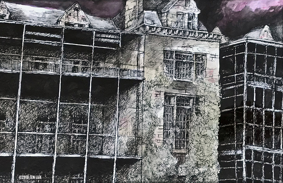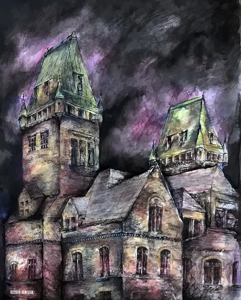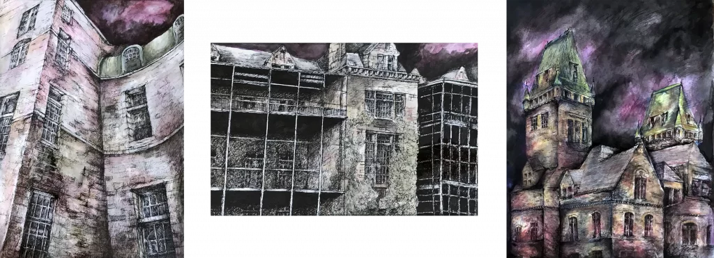 Expressionistic renderings of the former Buffalo Psychiatric Center designed in the late 1880s by H.H. Richardson. It is now The Richardson Olmstead Complex, a mixed space which includes a luxury hotel, a conference center, and a museum. Additionally, a portion of the campus houses the Lipsey Architecture Center. It is a National Historic Landmark set on more than 40 acres of historic green space with a park campus designed by Fredrick Law Olmsted. For an interesting look at the history of this campus, watch the Video of the Richardson Olmstead Complex