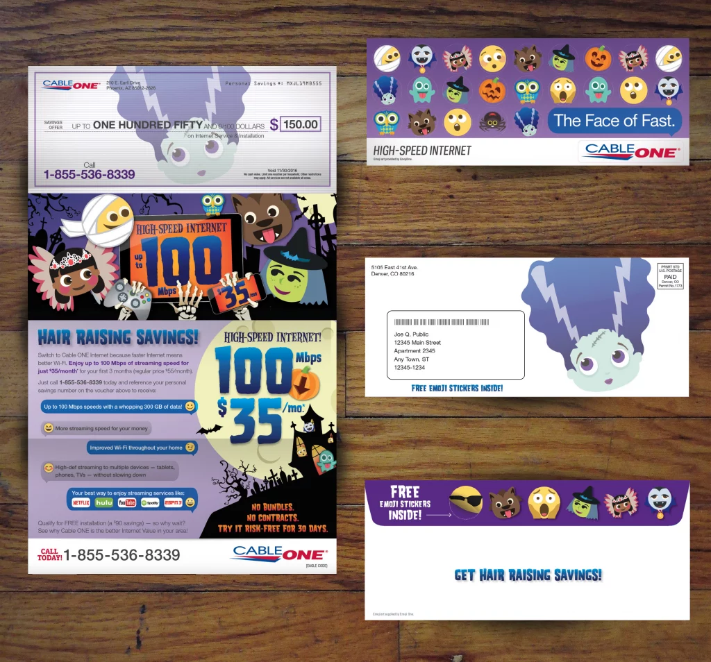 Using the proven strategy of Direct Mail (placement of offers, CTAs, simple text and “discount checks” I developed part of the Halloween print promotion to include the enticement of “free emoji stickers” to get the customer to open the mail (which is a major goal post of this type of advertising). The stickers were diecut on a regular-sized buckslip and featured custom Halloween emojis that I created (along with a few existing ones). They had a non-permanent adhesive so little ones couldn’t ruin surfaces, and by having them used on projects or other places, keept CableOne top-of-mind in the household long after the maildrop.