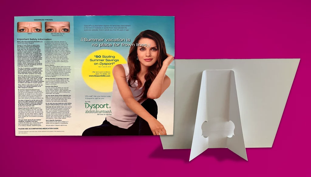 Dysport® was a competitor of Botox®, with the same uses and indications, but at a lower price-point. The advertising for this brand focuses mainly on the correction of frown lines between the eyes. Many pieces of collateral were created such as Ads, Magazine wraps, scientific presentations and information pieces for doctors, Flip-books, packaging, and more. Below are some examples.