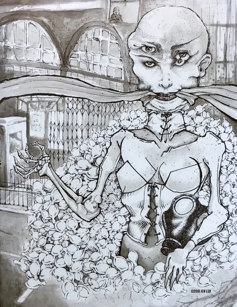 This piece began as a collage of photographic images and was then completely redrawn in ink and embellished with additional details (such as the surrealistic eyes). It was also an exploration of textural techniques in terms of shading and stylized shadow.