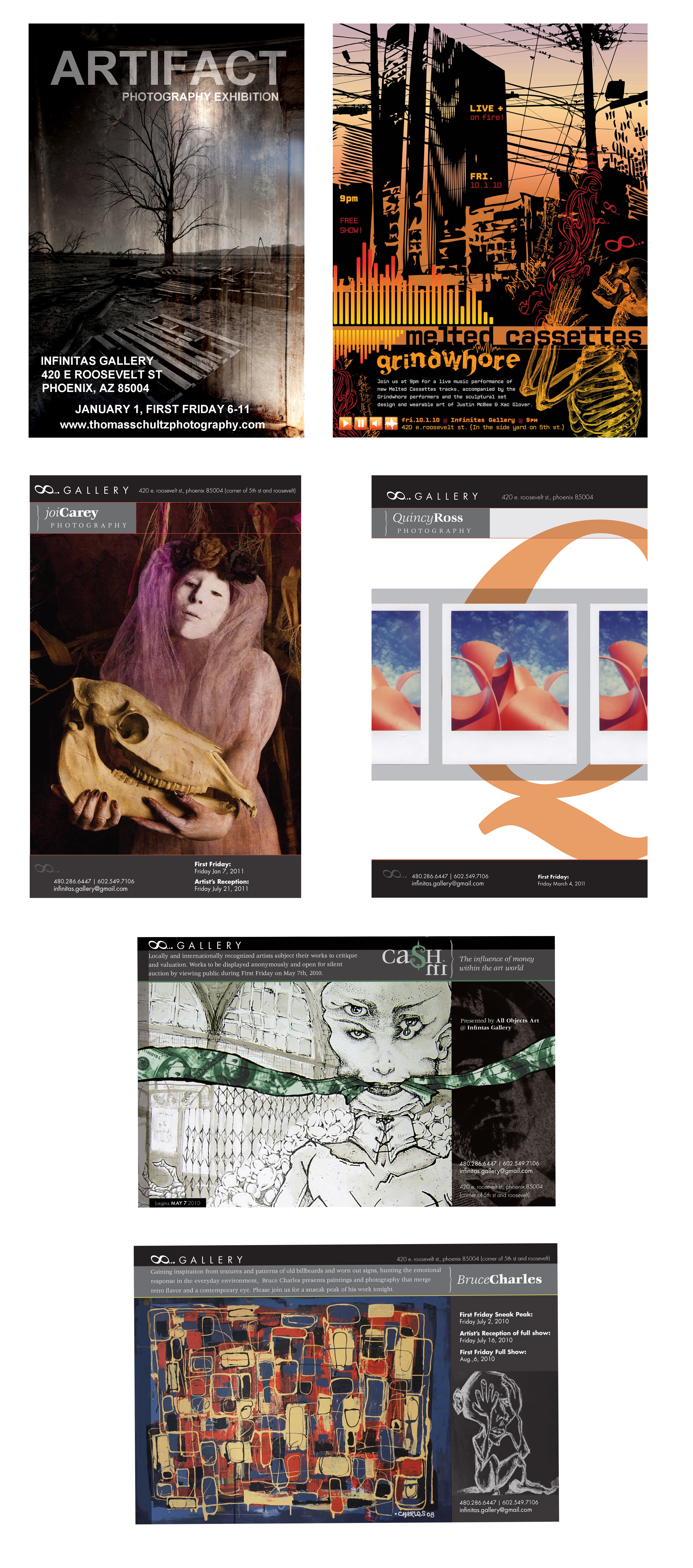 As creative director, I also handled all the branding and marketing—designing our logo, signage, and promotional materials, plus managing social media, print fliers, and press releases to keep people excited about what was coming next. It was all about connecting local artists and musicians with art lovers in one of downtown Phoenix’s coolest neighborhoods. Some of the branded items and event posters are shown below.
