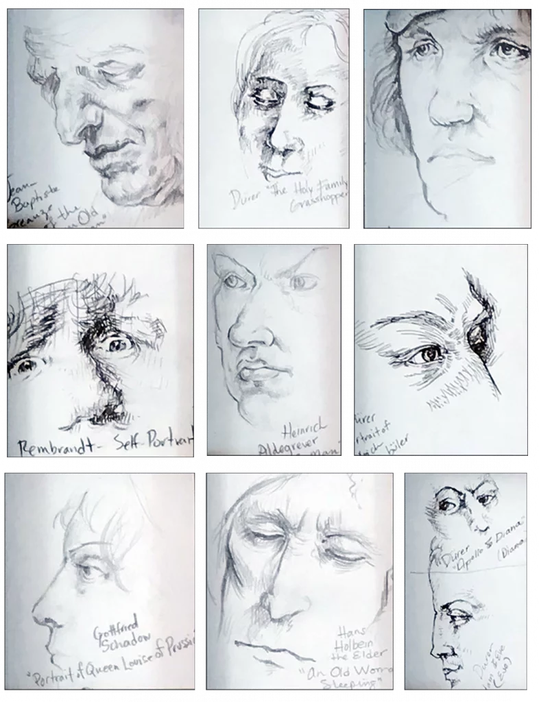 From time to time, I like to hone my skills by sketching faces of the Old Masters’ works such as Rembrandt, Dürer, and both Hans Holbein the Younger and Hans Holbein the Older. It’s a nice way to relax and draw when I am in-between projects. Most of the sketches shown are from the Renaissance—one of my favorite periods in Art History.